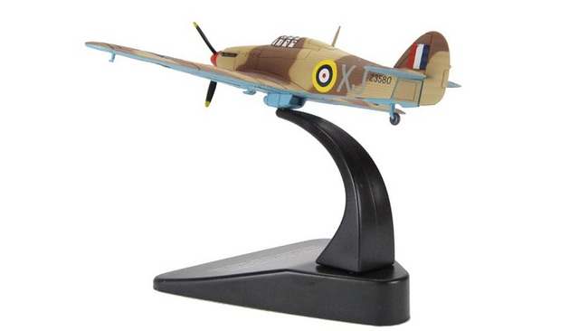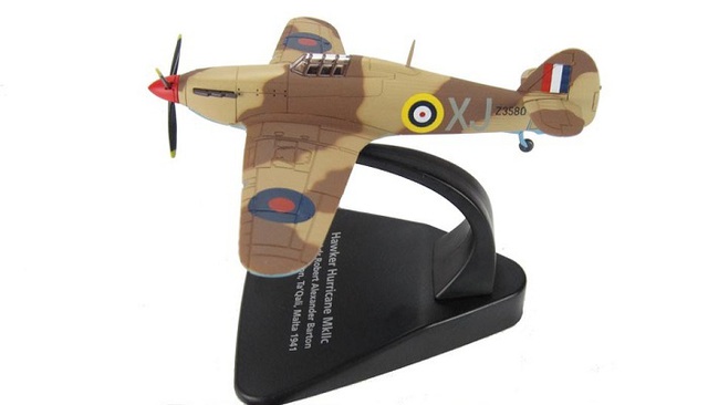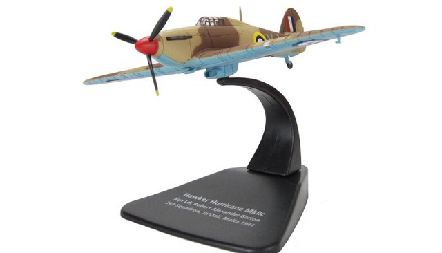 British single-seat fighter. The Hurricane was the work-horse of the Battle of Britain, accounting for 60% of RAF air victories during the battle. It served in all the major theatres of the Second World War. Shown here is the Mk IIC flown by Squadron Leader Robert "Butch" Barton, 249 Squadron RAF, Malta. Has realistic panel lines and surface details. Comes with display stand. Fixed, non-spinning propeller. No pilot figure.