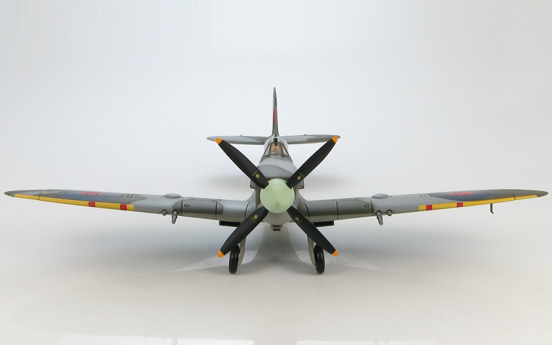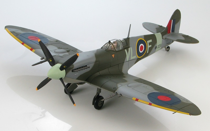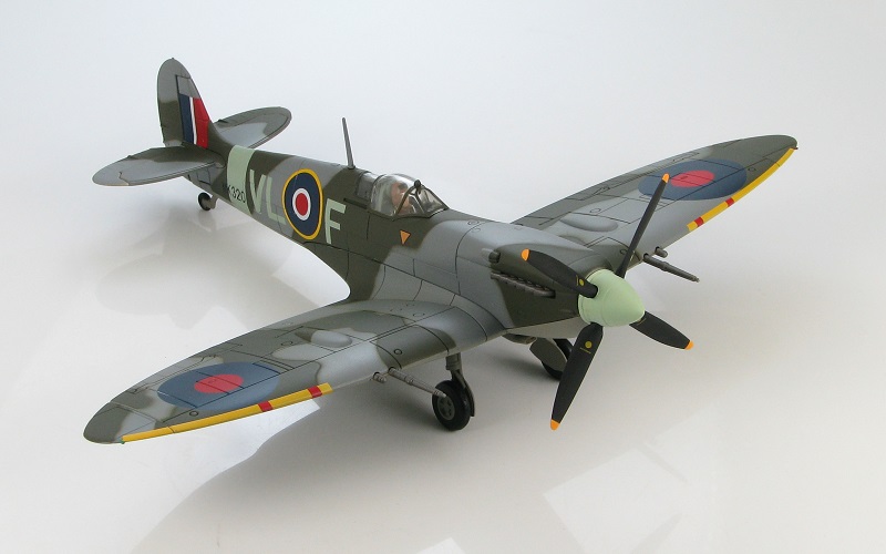 Supermarine Spitfire IXb "VL-F" MK320, RAF No.322 (Dutch) Squadron, 1944. The Mk. IX replaced the Mk. V in June 1942 and continued in service until the end of WWII. Diecast metal with a minimum of plastic. Metal propeller. Canopy slides open and pilot figure can be removed. Landing gear is fully retractable and can be displayed up or down. Comes with display stand.